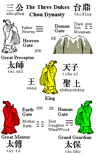 I have taken some liberties in the presentation of the Three Senior Lords, placing them with associations drawn from the theory of Yin and Yang and the five Chinese Elements. I base this on a footnote in an edition of The Romance of the Three Kingdoms [, Three Kingdoms, attributed to Luo Guanzhong, Foreign Language Press, Beijing, 1995, 2007, Volume I]. There it says, "the sangong, the Emperor's closest confidants...were also identified with Heaven, earth, and man" [Note 2 to Chapter 2, p.548]. Now, Heaven, Earth, and Man are traditionally the "Three Powers," , but they also match up with three of the four "Spirit Gates" that figure in Yin-Yang theory and Chinese geomancy. This seems past coincidence, and also that a Minister of the Emperor would not be identified with the fourth Spirit Gate, the "Demon Gate" (and where Demons do not figure as a "power," ). So I have added these associations, with their Trigrams, to the diagram above. The Demon Gate, associated with the North-East and the Mountain Trigram, is something that needs guarding, as we find the old Japanese capital of Kyoto guarded by the temples to the North-East on the "Sacred Mountain," Mt. Hiei. Now, I don't think it is an accident that the Three Senior Lords should be associated with the Spirit Gates. The liberty I have taken is with the colors. Yellow is indeed the color of the Center and the Emperor. Green, red, and white, however, are not otherwise associated with Spirit Gates, but with the elements of the cardinal directions, wood to the East, fire to the South, and metal to the West, respectively. I have simply rotated these, beginning with green for the South-East, where, after all, the Trigram actually is associated with wood. The fifth color, black for water and North, would rotate to the Demon Gate, where, indeed, demons might traditionally be portrayed in black.
